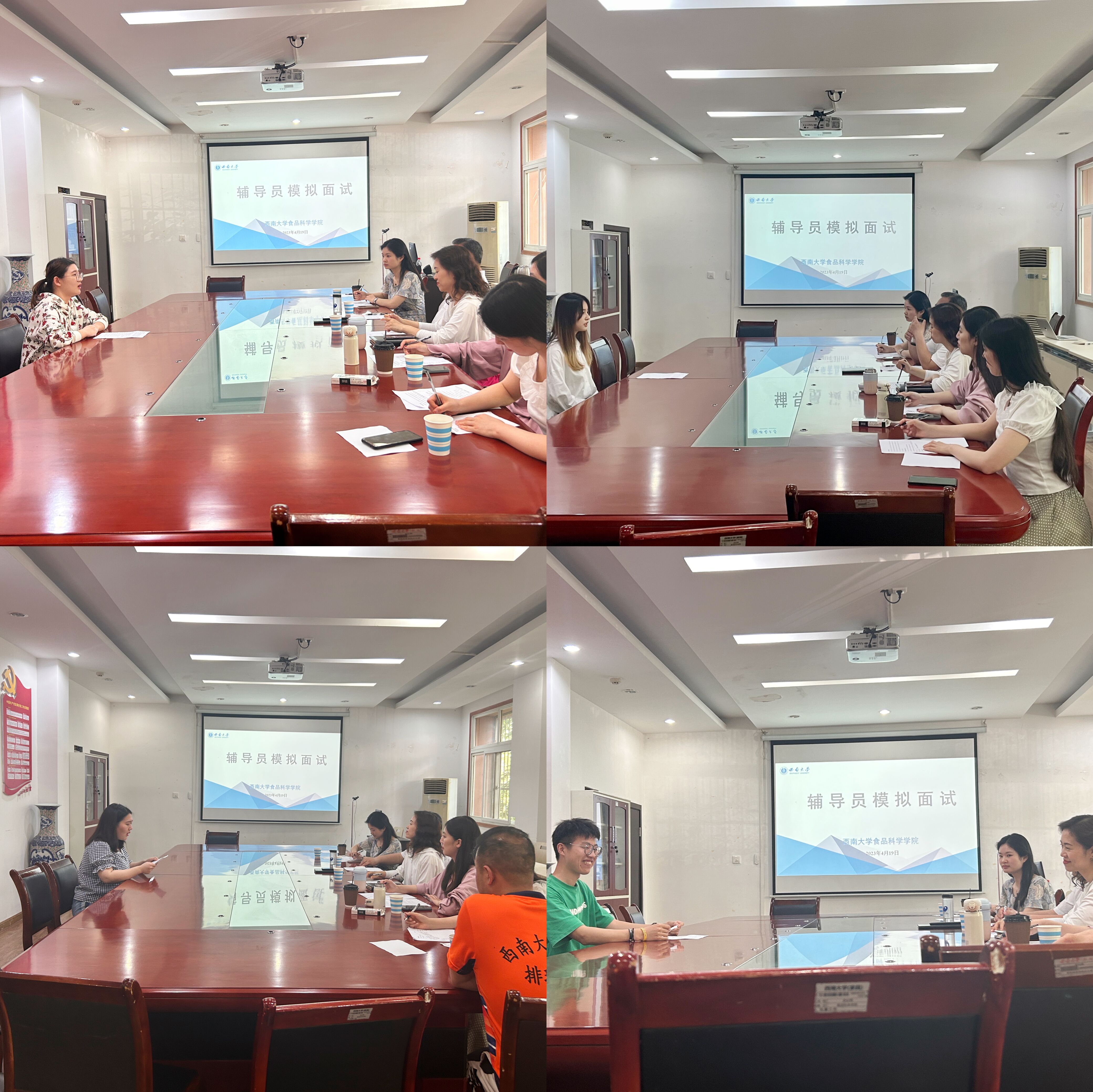 通过问卷调研和辅导员谈心谈话等形式后,对2023届毕业研究生的高校求职意向进行摸排,深入分析了毕业生的求职需要,于4月19日下午2:30在40教206会议室组织开展了辅导员模拟面试活动。学院党委书记吴俊平、副书记刘秋艳、团委书记黄晔及辅导员张欢、杨希、夏雪受邀担任此次模拟面试主考官。