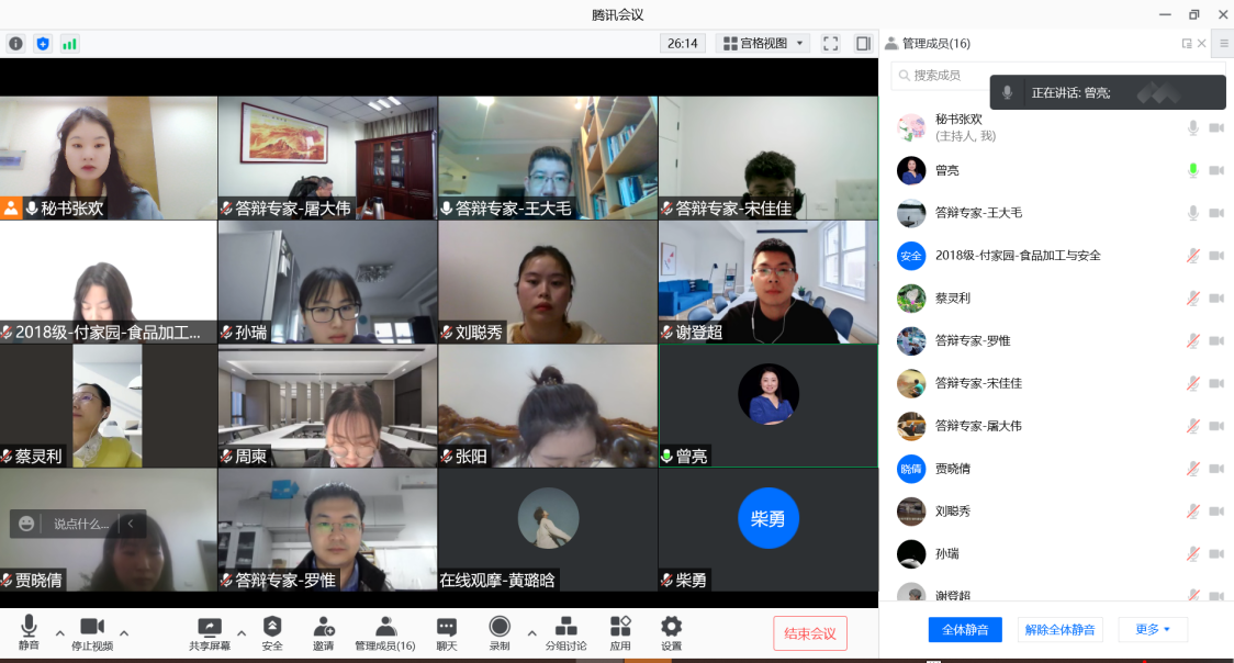 开展了特殊时期硕士、博士论文线上“云答辩”。答辩邀请到南昌大学聂少平教授、内蒙古农业大学孙志宏教授、哈尔滨商业大学张娜教授、华南理工大学游丽君教授以及重庆市农业科学院、重庆万标检测有限责任公司的专家、学者担任答辩委员,成人影片