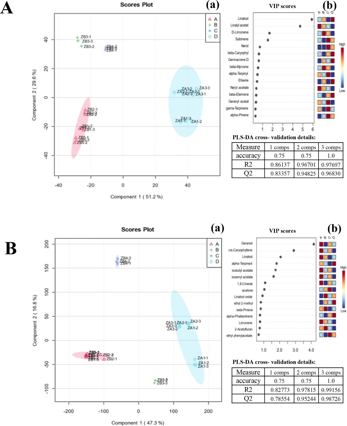 图1. 偏最小二乘-判别分析(PLS-DA)图。A.GC-MS,B.GC-IMS