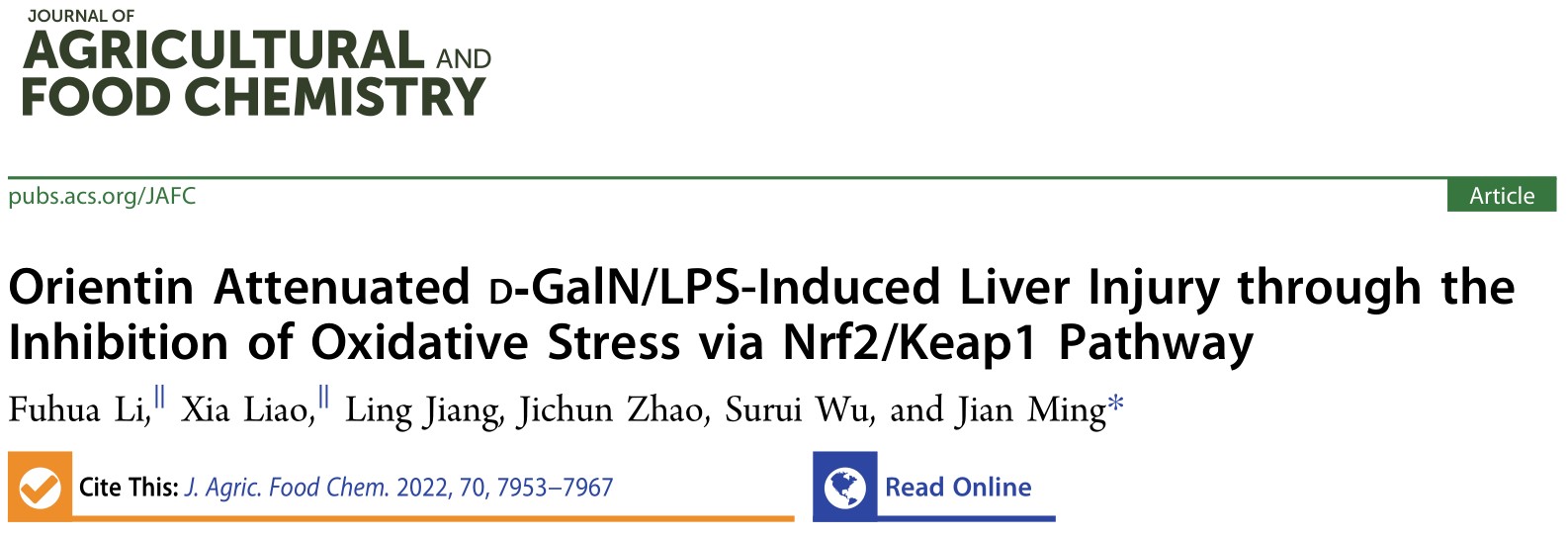 川渝共建特色食品重庆市重点实验室明建教授科研团队在荭草素减轻肝损伤机制研究中取得重要进展,研究成果被Journal of Agricultural and Food Chemistry国际期刊收录,并以封面文章发表。