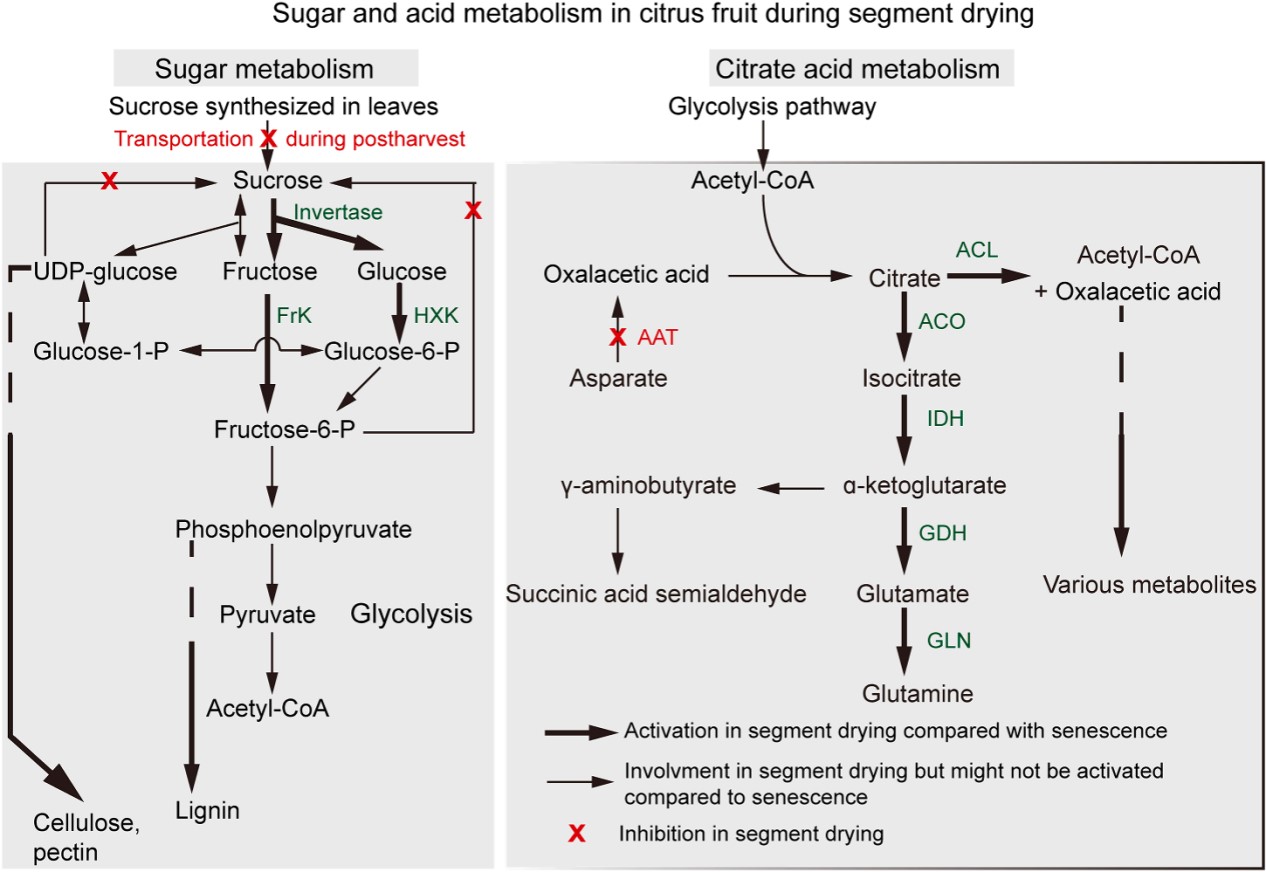 柑橘枯水进程中糖酸风味丧失表明糖酸代谢途径发生了改变(图2)。主要包括:蔗糖合成被抑制、同时蔗糖降解和己糖消耗被激活导致可溶性固形物的大量消耗;乙酰辅酶A途径、谷氨酰胺途径和呼吸途径等柠檬酸降解途径被激活;同时,糖酸降解途径为细胞壁组分合成途径提供能量和底物。