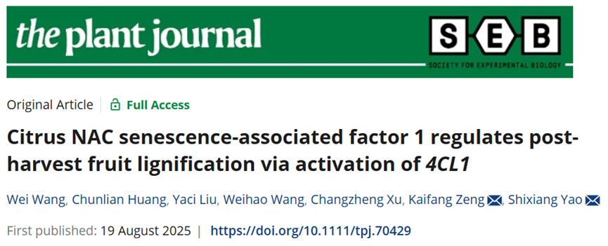 果蔬物流保鲜与营养品质调控团队曾凯芳教授和姚世响教授在国际植物科学权威期刊《植物杂志》(The Plant Journal)发表了题为《柑橘NAC衰老相关因子1通过激活4CL1调控采后果实木质化》(Citrus NAC senescence-associated factor 1 regulates post-harvest fruit lignification via activation of 4CL1)的研究论文,发现调控柑橘采后枯水的关键基因—CitNSF1 (Citrus NAC senescence-associated factor 1),并揭示其通过激活苯丙烷合成途径的结构基因Cit4CL1等,促进木质素合成和枯水发生的分子机制。