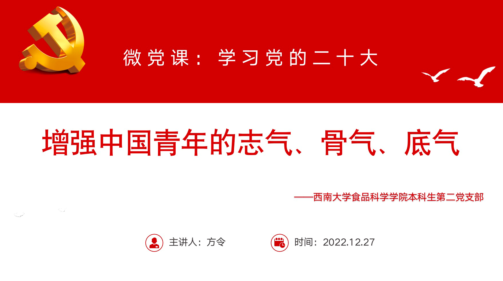 本科生第二党支部书记方令同志在这次大会上给大家讲了一堂关于“增强中国青年的志气、骨气、底气”的微党课,生动形象的向大家阐述了如何做一名符合时代发展的“中国青年”。