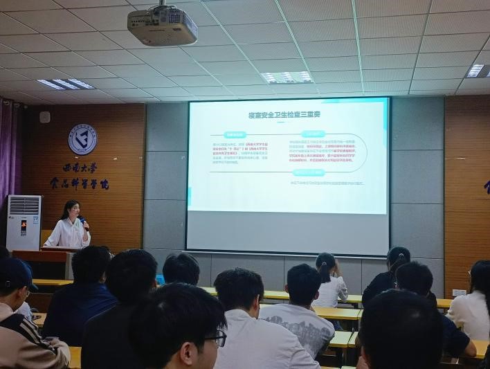 学生寝室内务卫生规范》,要求各寝室长严格按照文件对寝室成员做好管理。随后,夏雪用图文并茂的方式详细说明寝室安全卫生检查存在的常见问题,各寝室要加强寝室内务卫生、寝室违规电器使用、寝室挂牌等,发现问题及时向辅导员反馈。最后,全体寝室长们以小组为单位进行头脑风暴,积极思考“如何更好地构建寝室文化”,现场各小组讨论激烈,各抒己见,分别从寝室卫生安全、学习、日常生活、学生工作、社会实践等各方面提出意见。