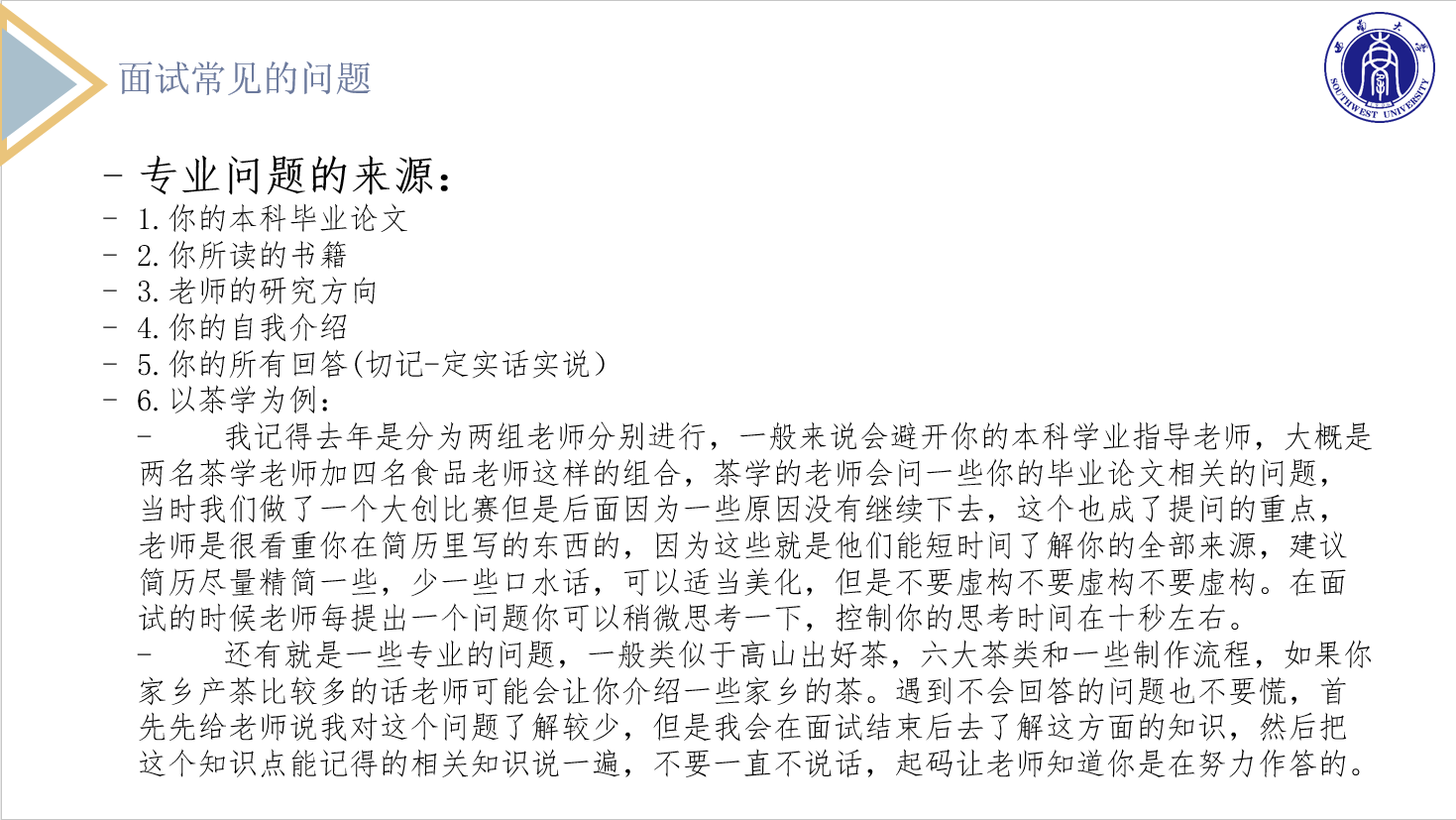 持续“经验分享会”,做好就业升学的“领航员”。2023年3月,在线上进行了就业和考研复试专场分享会。就业会场邀请了在涪陵榨菜集团、中国农业银行、江西省赣州市寻乌县长宁镇人民政府工作的往届毕业生宣讲。3位往届毕业生从备考、简历制作、面试、选岗、主要工作内容等多个方面进行了分享。考研复试会场邀请了目前就读于中国农业大学、成人影片