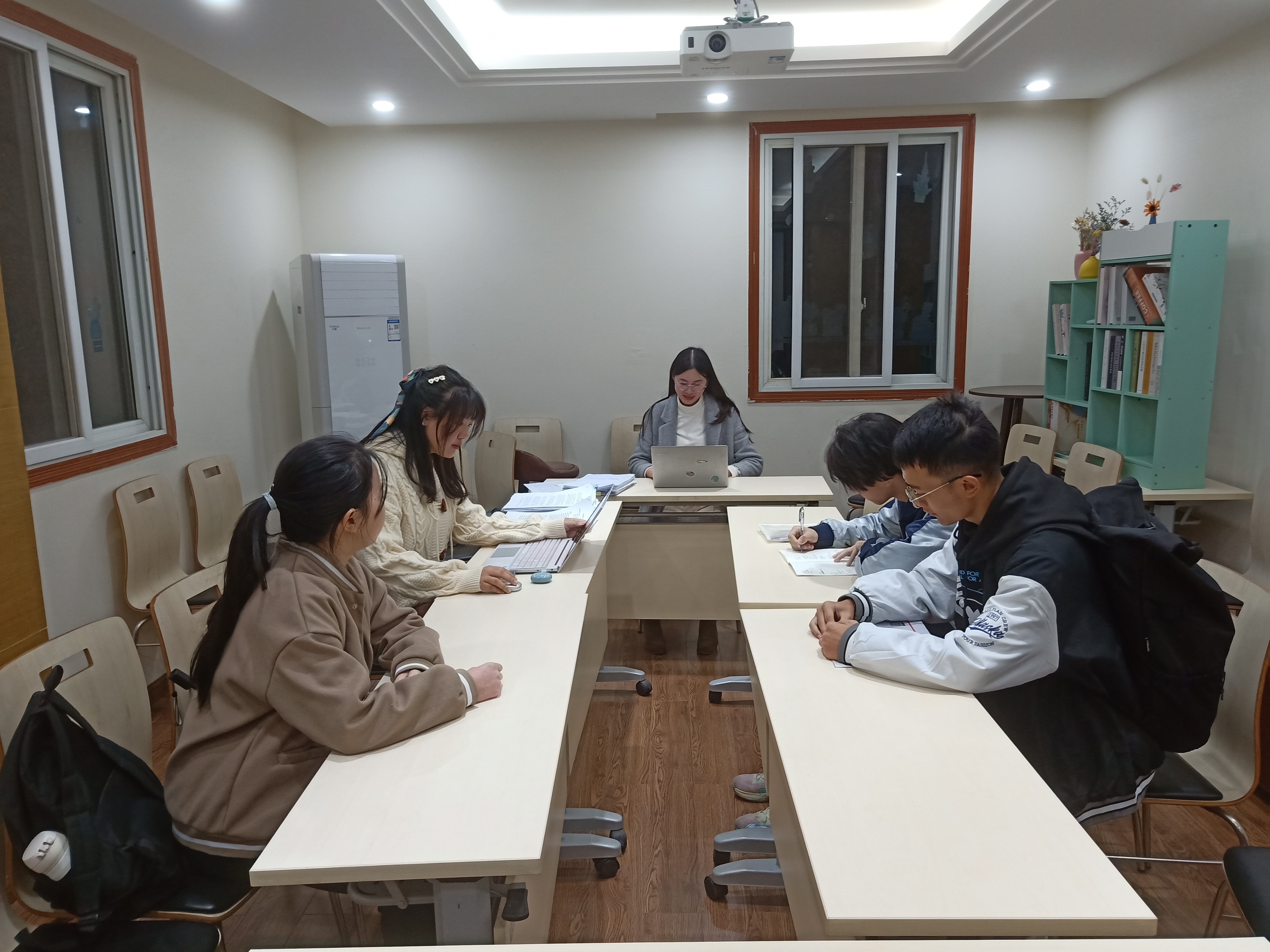 40教220办公室顺利召开,辅导员夏雪老师出席本次会议,助理辅导员任峻德、2021级年级长李瑞兴、代安琪、江薇和朱柯参加会议。