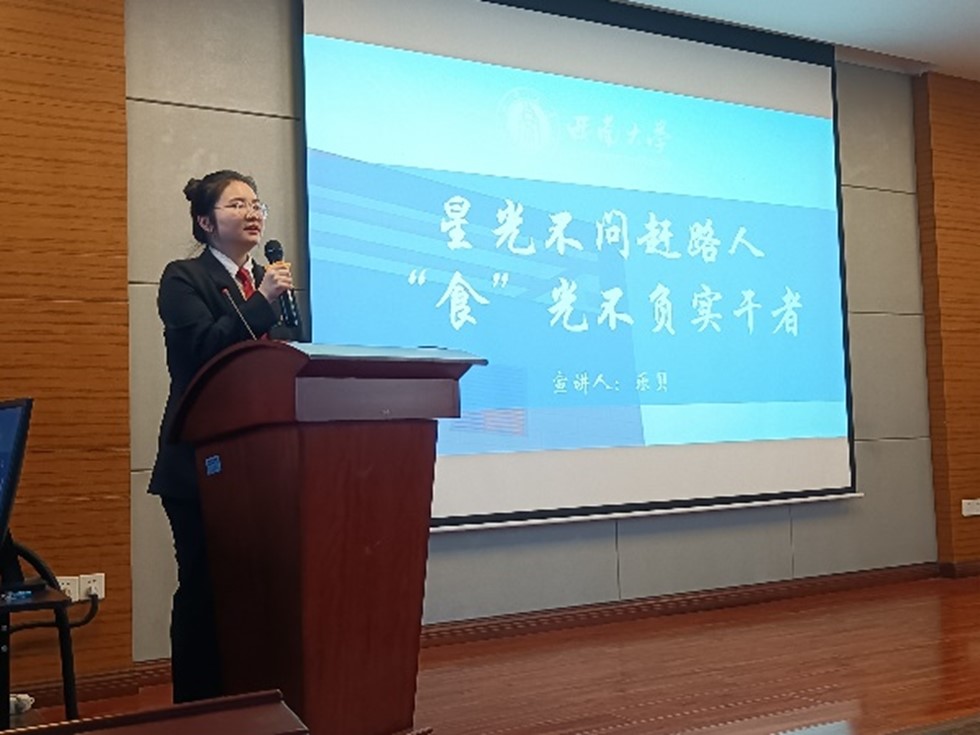 食品科学与工程专业的乐贝学姐则以“‘食’光不负实干者”为题,以“星光不问赶路人,时光不负有心人”为纲,讲述了自己的大学故事,为本学院的学弟学妹们树立了优秀榜样。