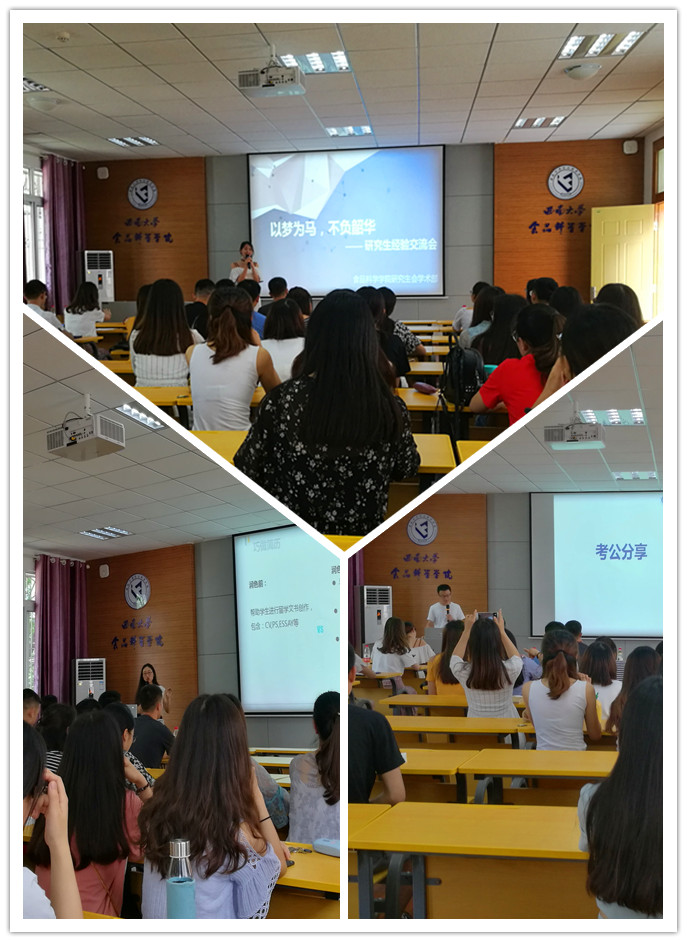 研究生会学术部主办的研究生经验交流会在39教315举行。研究生师姐李双红、研究生师兄张晨曦、张东以及博士师姐张媛、高瑞萍作为应邀嘉宾与大家进行经验交流,低年级研究生参加。