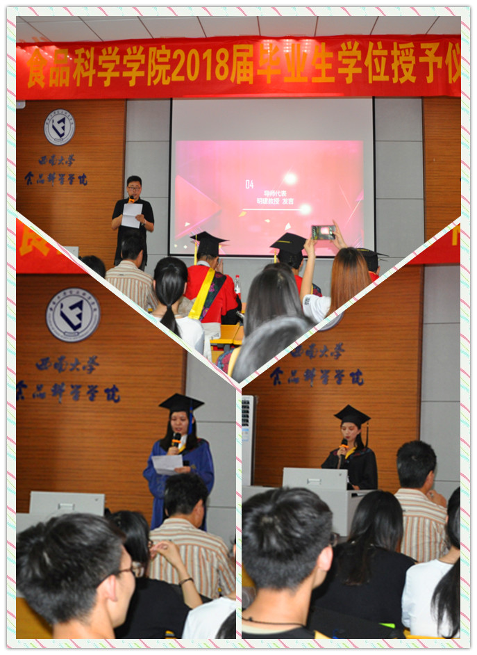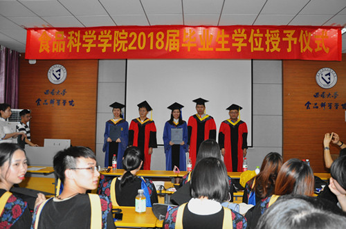 随后进行授位仪式。学位获得者们依次上台,院学术委员会成员赵国华教授、曾凡坤教授及导师张宇昊教授为其颁证、拨穗并合影。授位过程中,部分毕业生与导师热情拥抱并激动落泪,场面温馨感人。 授位仪式圆满结束,“含弘光大,继往开来”的西大精神的种子已经种下,母校期待着每一颗种子未来都能开花、结果。愿毕业生们在未来的道路上一马平川、前程似锦。
