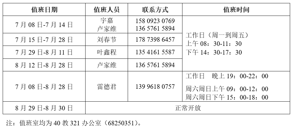 为保障暑假期间师生有序开展实验活动,成人影片 仪器设备共享服务平台及教学实验室正常开放。值班安排如下: